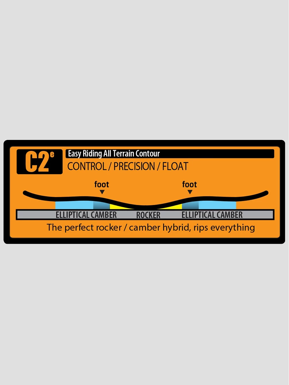 Das C2e Profil ist etwas weicher als C2 und kommt mit einem Rocker zwischen den Bindungen und mit einem Camber unter den Bindungen. Diese Kombination bietet einen guten Kantenhalt dank der Camber-Bereiche, sowie einen guten Auftrieb und grenzenlose Freestyle Action ohne Verkanten.